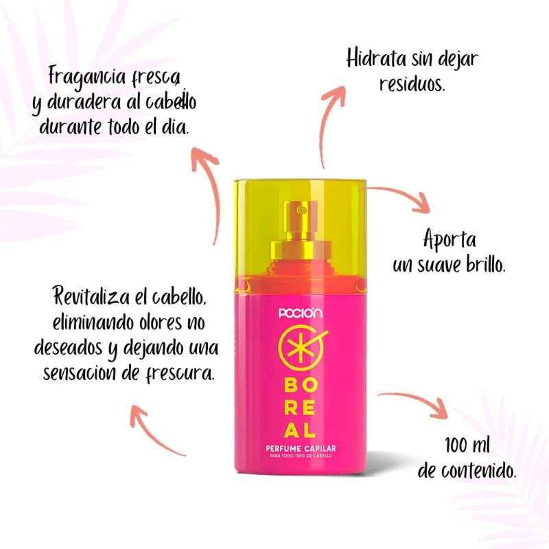 El perfume capilar Boreal de La Poción es un spray con fragancia cítrica y frutal, que perfuma, hidrata y detoxifica el cabello, eliminando residuos, aportando brillo y fortaleciendo la fibra capilar sin dejar sensación grasosa.