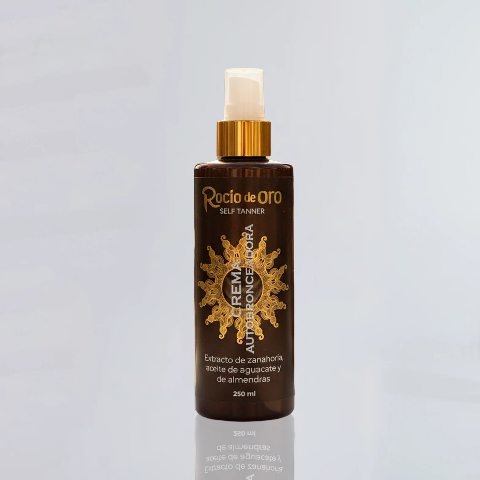 La crema autobronceadora Rocío de Oro es un tratamiento cosmético diseñado para lograr un tono bronceado natural sin necesidad de exposición directa al sol. Su fórmula combina aceites nutritivos como el aceite de almendras y el aceite de aguacate, junto con extractos naturales de frutas y plantas como fresa, ciruela, mora, linaza y zanahoria, además de aminoácidos que ayudan a mantener la piel hidratada y saludable.