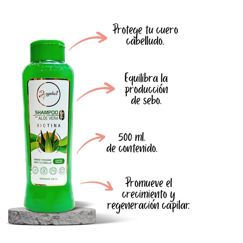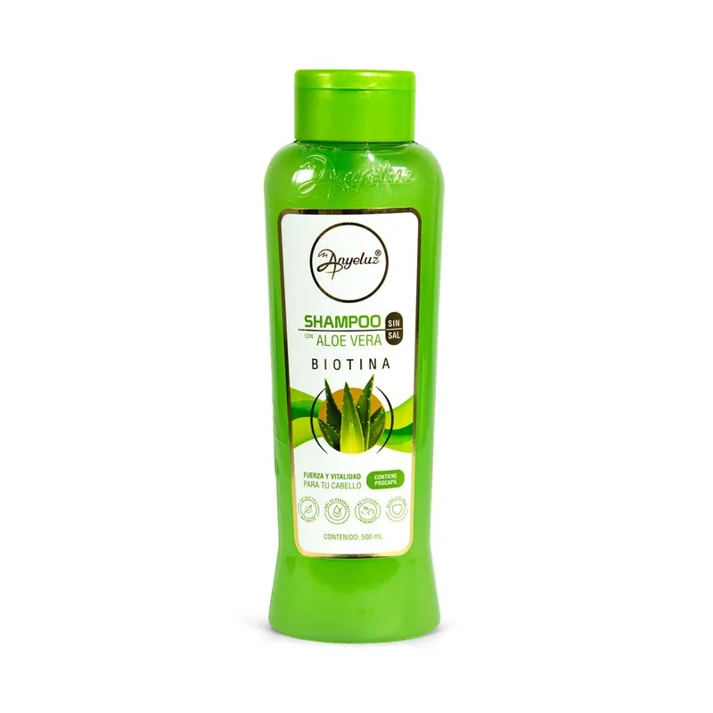 El shampoo de aloe vera y biotina de Anyeluz es un tratamiento capilar diseñado para limpiar profundamente, fortalecer y revitalizar el cabello desde la raíz hasta las puntas. Su fórmula combina ingredientes naturales como el aloe vera, la biotina, el colágeno y la queratina, que trabajan en conjunto para mejorar la salud del cuero cabelludo y la fibra capilar.