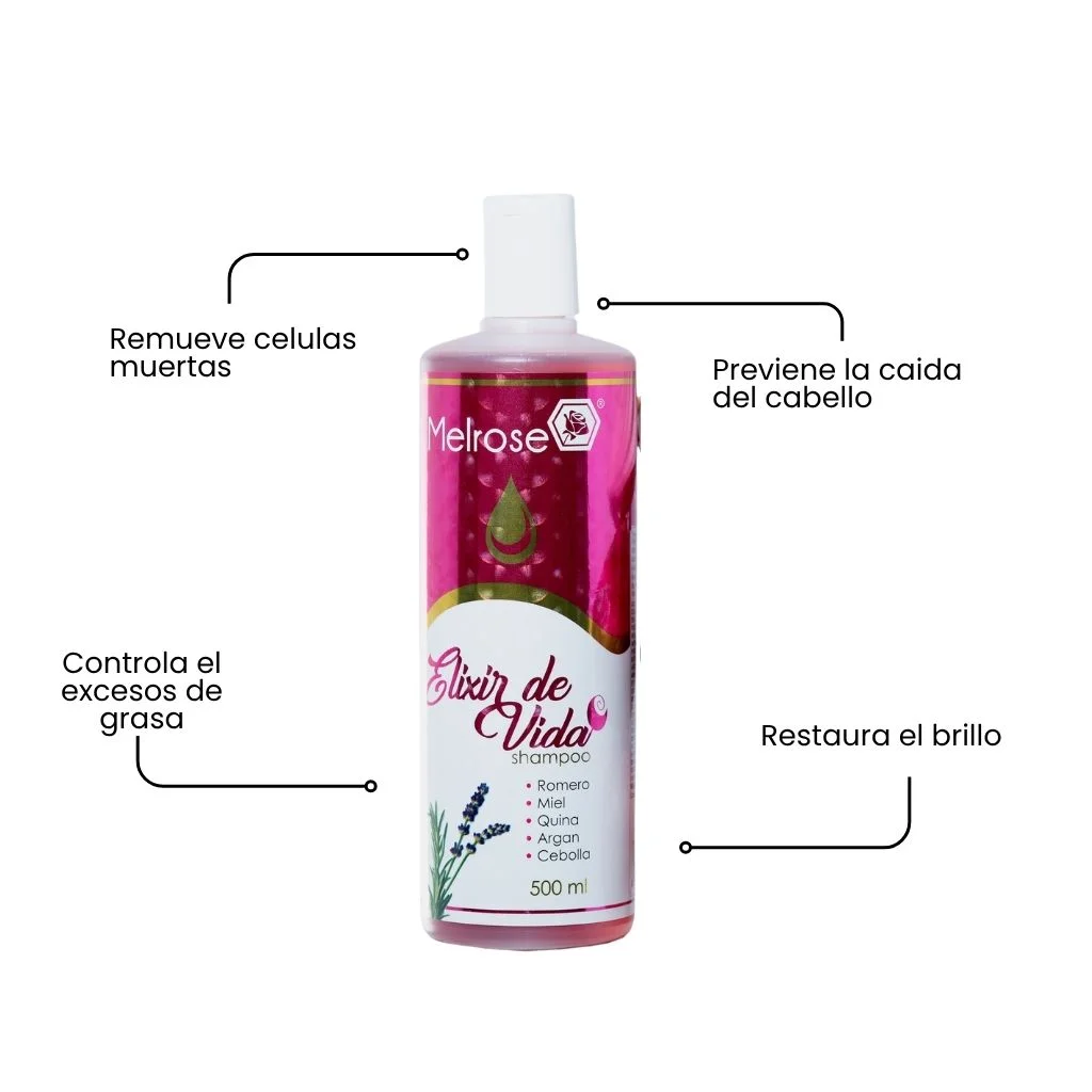 El Shampoo Elixir de Vida de Melrose es un tratamiento capilar diseñado para revitalizar, fortalecer y devolverle la vitalidad al cabello desde la raíz hasta las puntas. Su fórmula enriquecida con activos nutritivos ayuda a limpiar profundamente sin resecar, eliminando impurezas mientras aporta hidratación y suavidad. Ideal para cabellos débiles, opacos o maltratados, este shampoo contribuye a mejorar la resistencia, reducir el quiebre y promover un aspecto más saludable y brillante. Con su uso constante, el cabello luce más fuerte, manejable y lleno de vida, convirtiendo cada lavado en una experiencia de cuidado y renovación