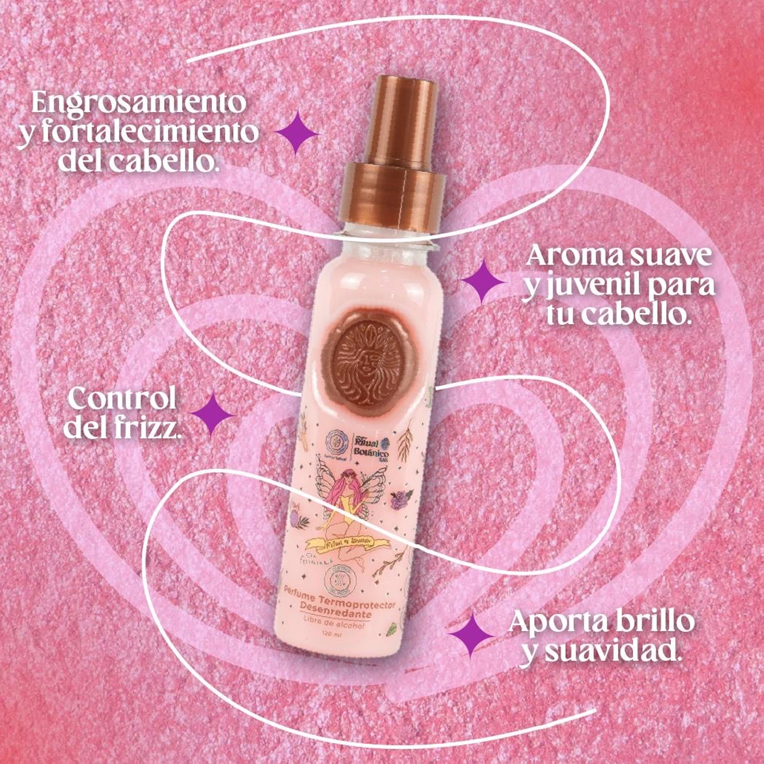 El termoprotector rosado de Ritual Botánico (Ritual de Seducción) es un spray capilar multifuncional diseñado para proteger el cabello del calor mientras lo perfuma y mejora su apariencia. Su fórmula ligera actúa como una barrera protectora frente a las altas temperaturas de herramientas como planchas, secadores y rizadores, ayudando a prevenir el daño, la resequedad y el quiebre.